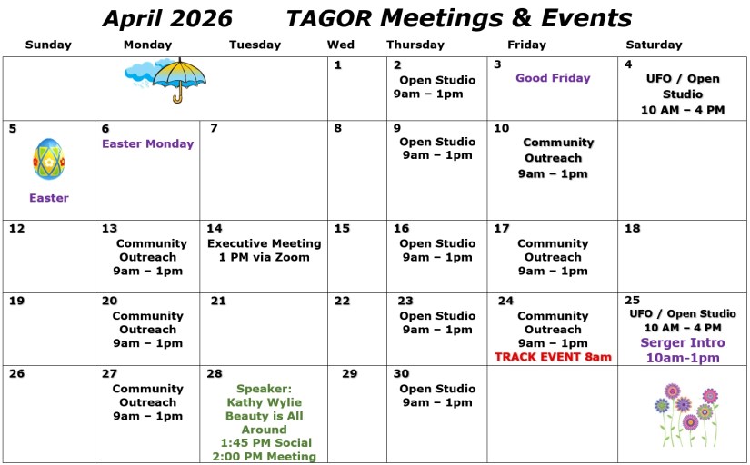 - Monthly Meetings – usually the fourth Tuesday of the month we gather as a guild for presentations, Show and Tell and meeting with each other from September to June. These meetings are usually held in the Creativity Lab in the Cultural Centre Annex.