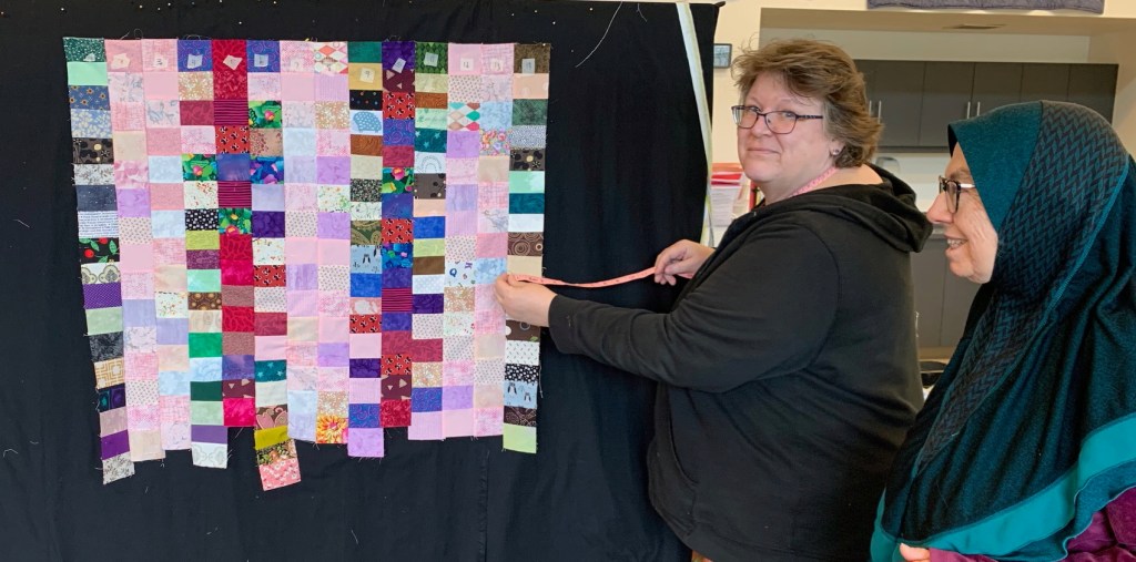 Our Fabric Arts Studio is located near the top of the stairs on the second floor of the Richmond Cultural Centre at 7700 Minoru Gate. It has lots of natural light and a treasure trove of fabrics, threads, other supplies and sewing tools for all our community donation projects. It is a great place to gather, work on and share ideas and expertise on both community and personal projects.