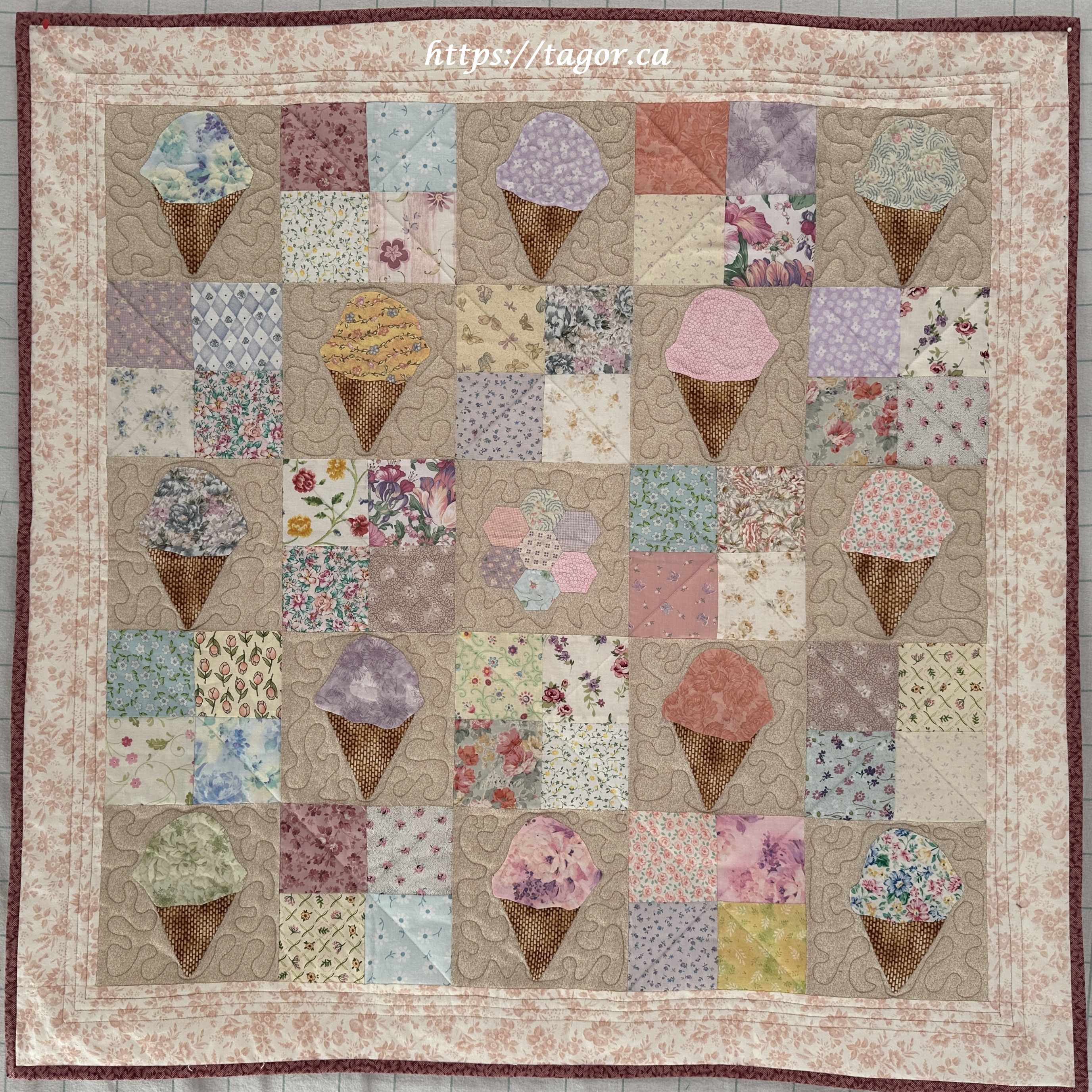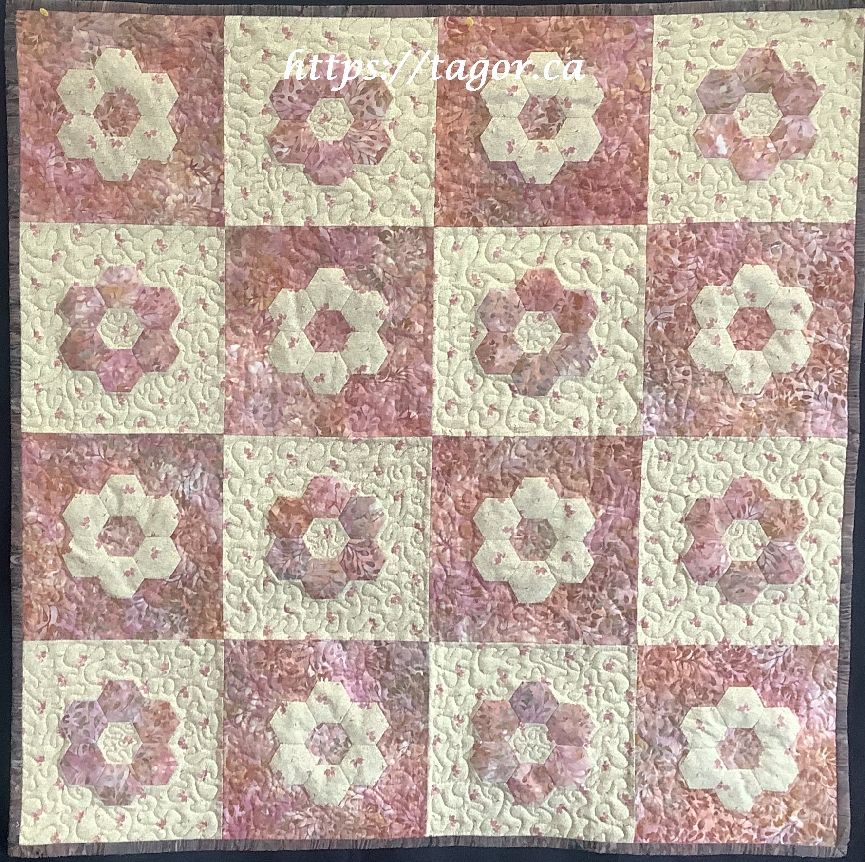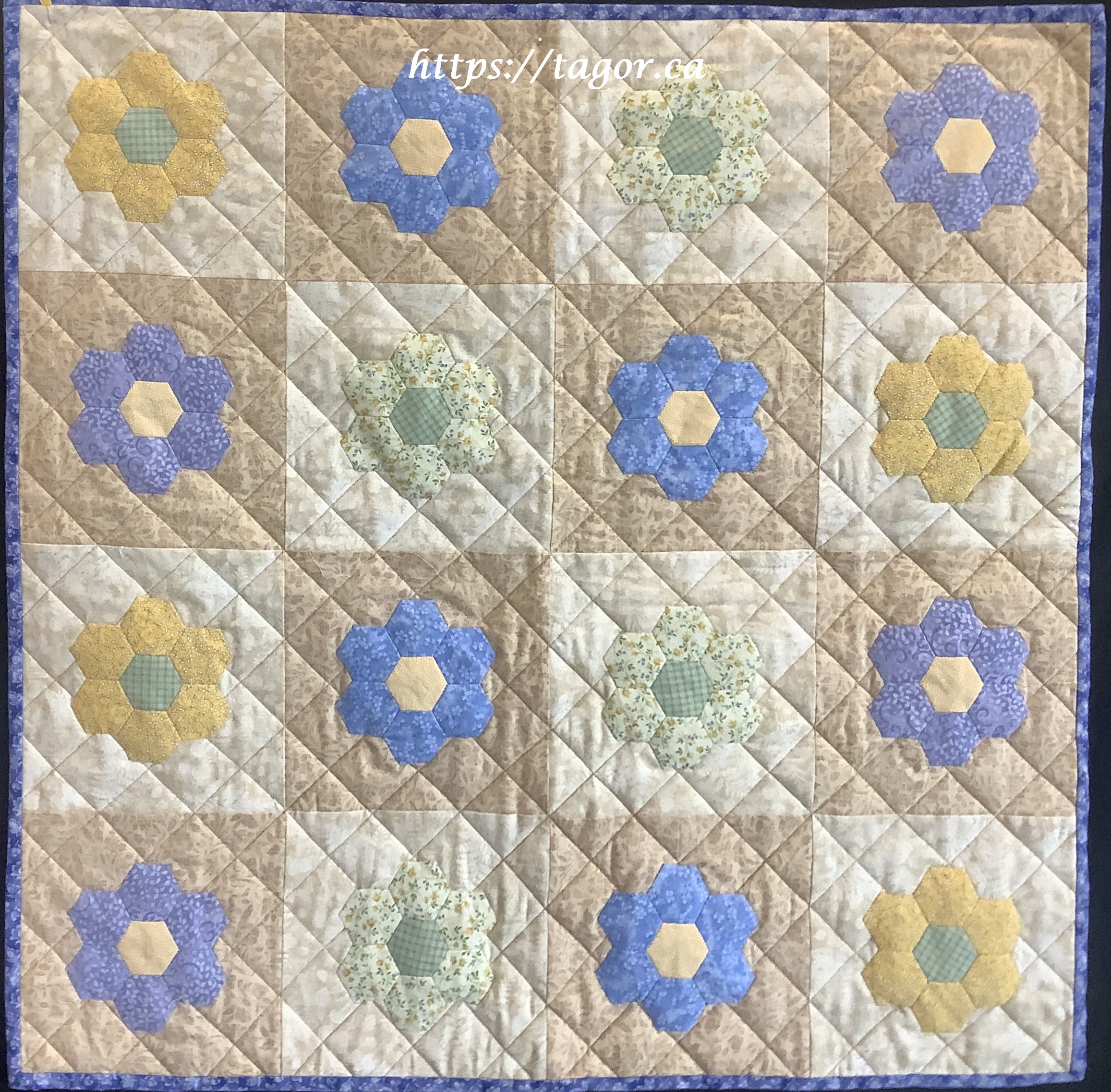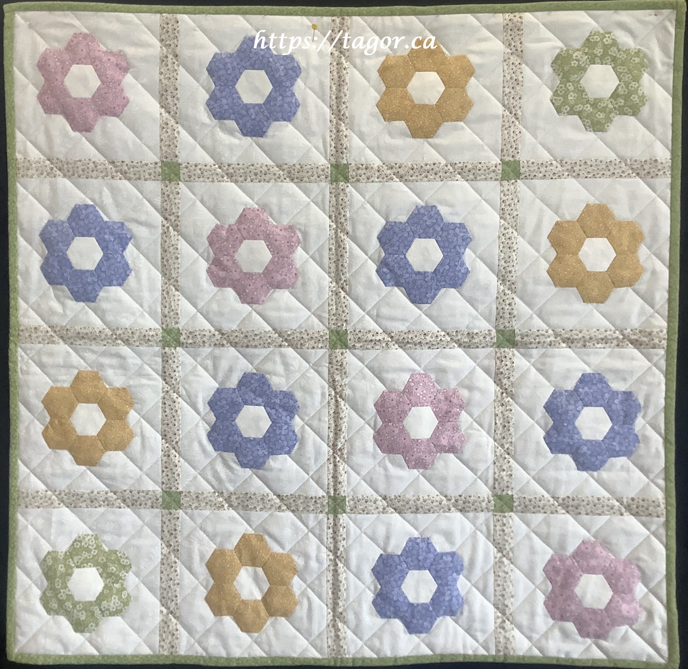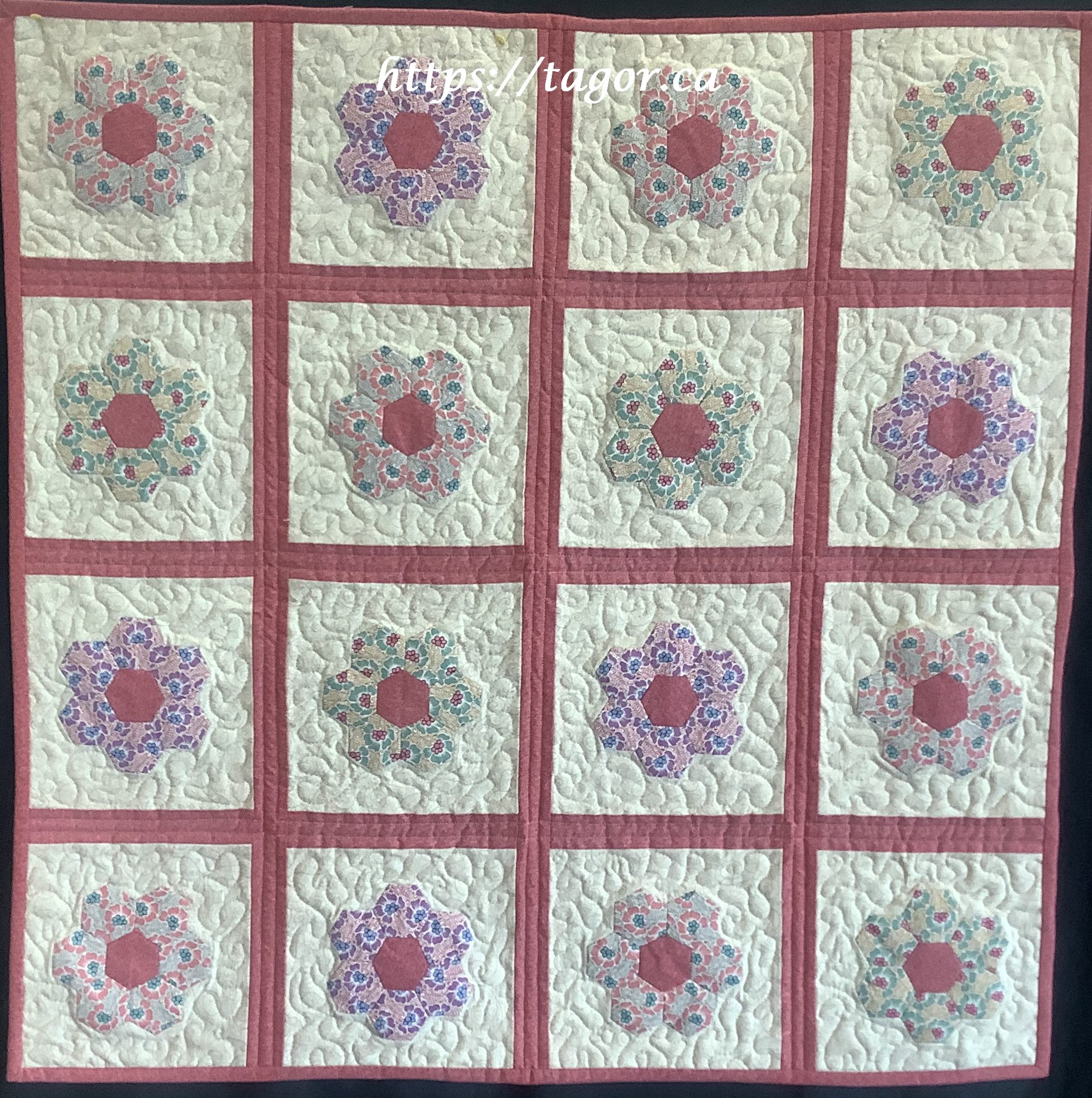 Donna went to town with hand appliquéd hexies! One block but the variations in fabric, sashing and quilting make each one unique.
