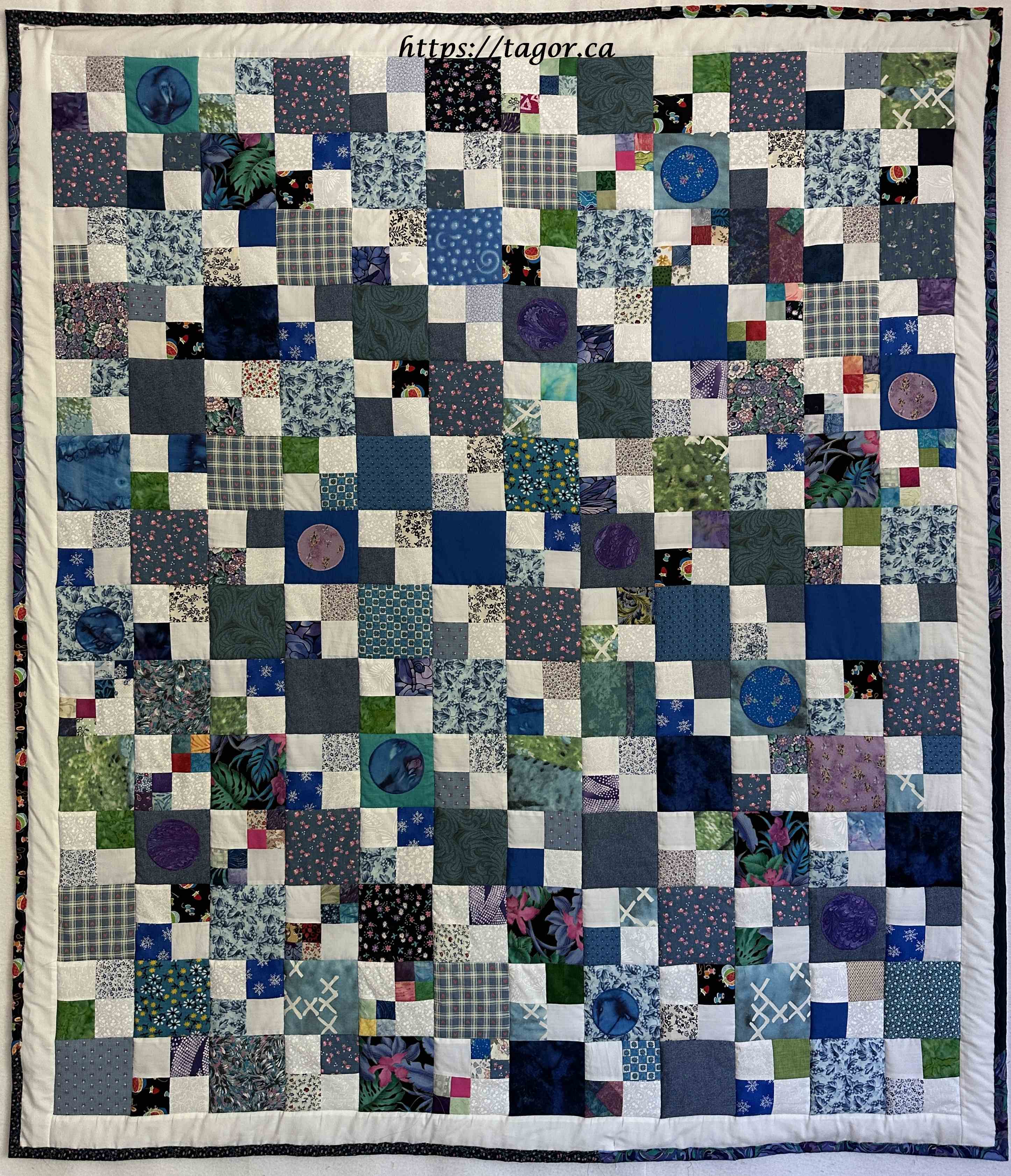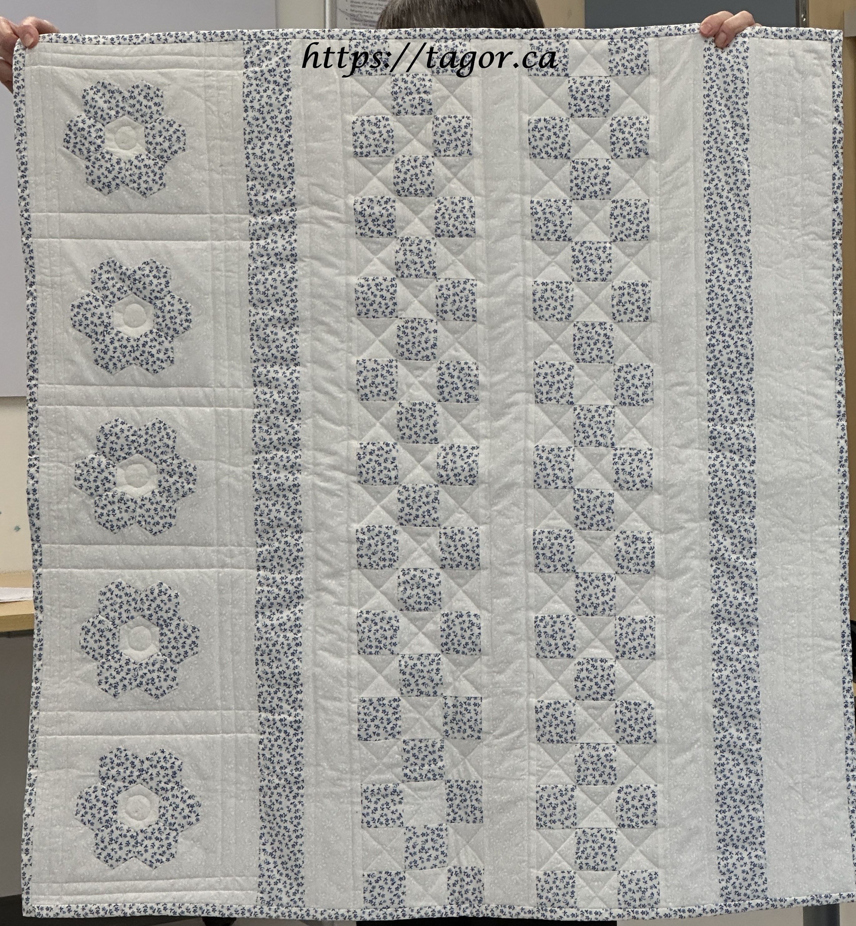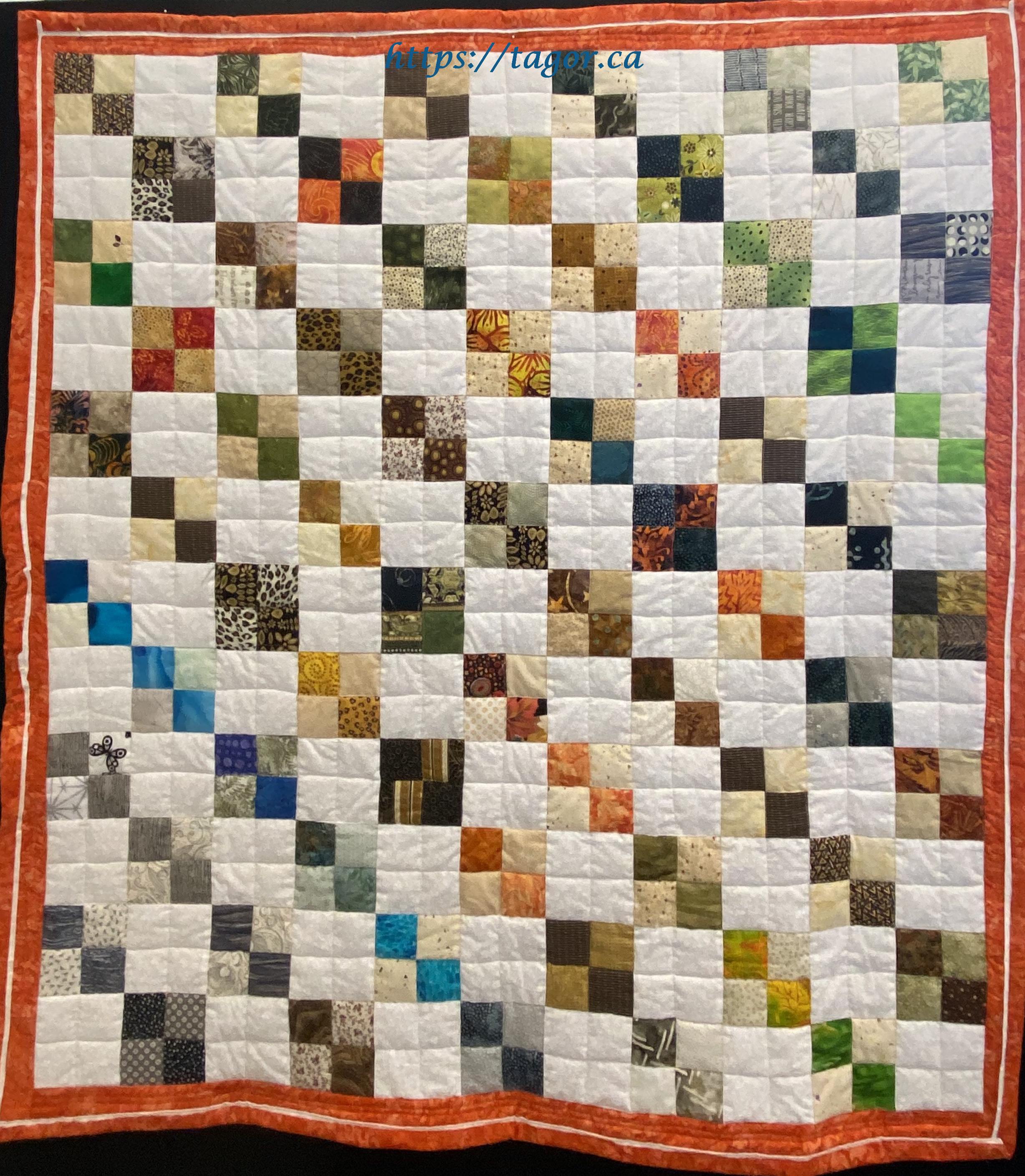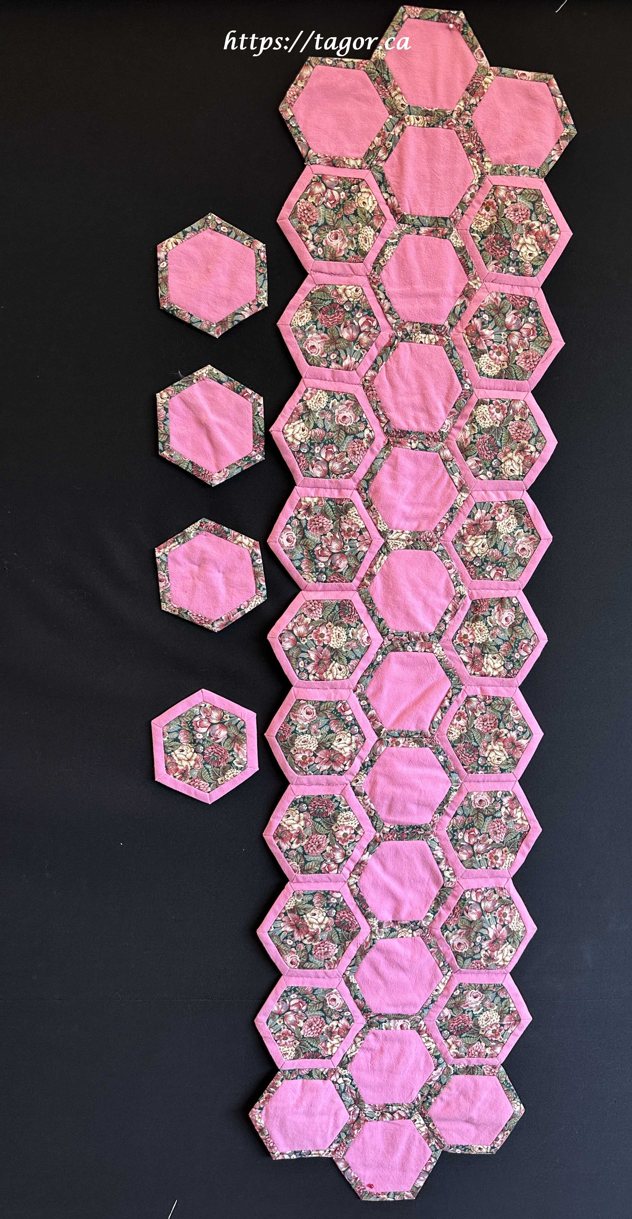 Donna went to town with hand appliquéd hexies! One block but the variations in fabric, sashing and quilting make each one unique.