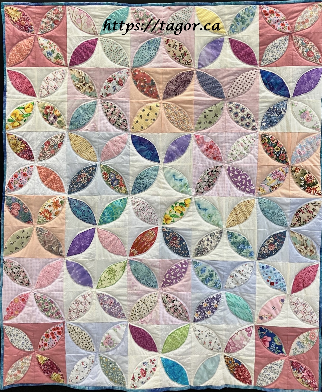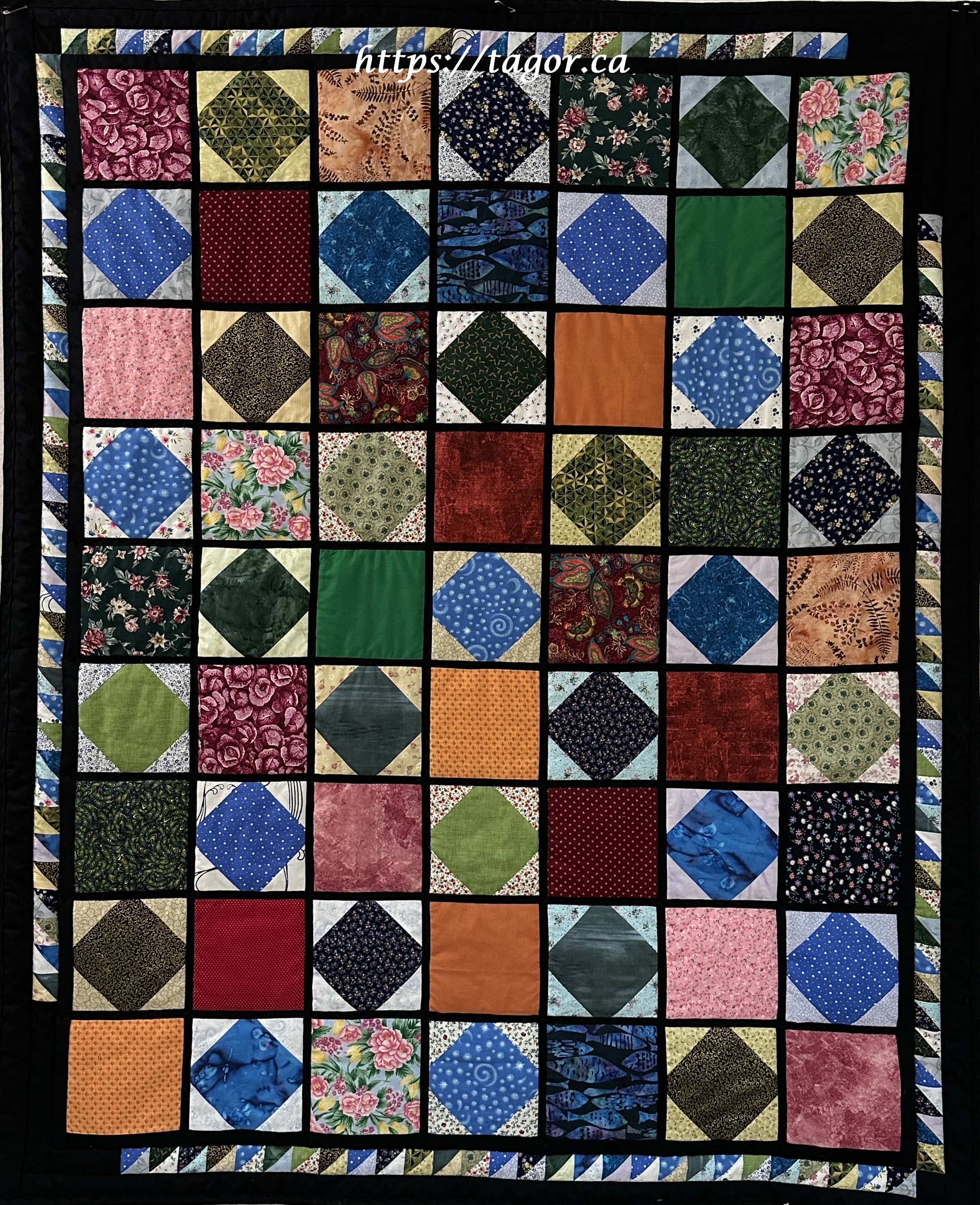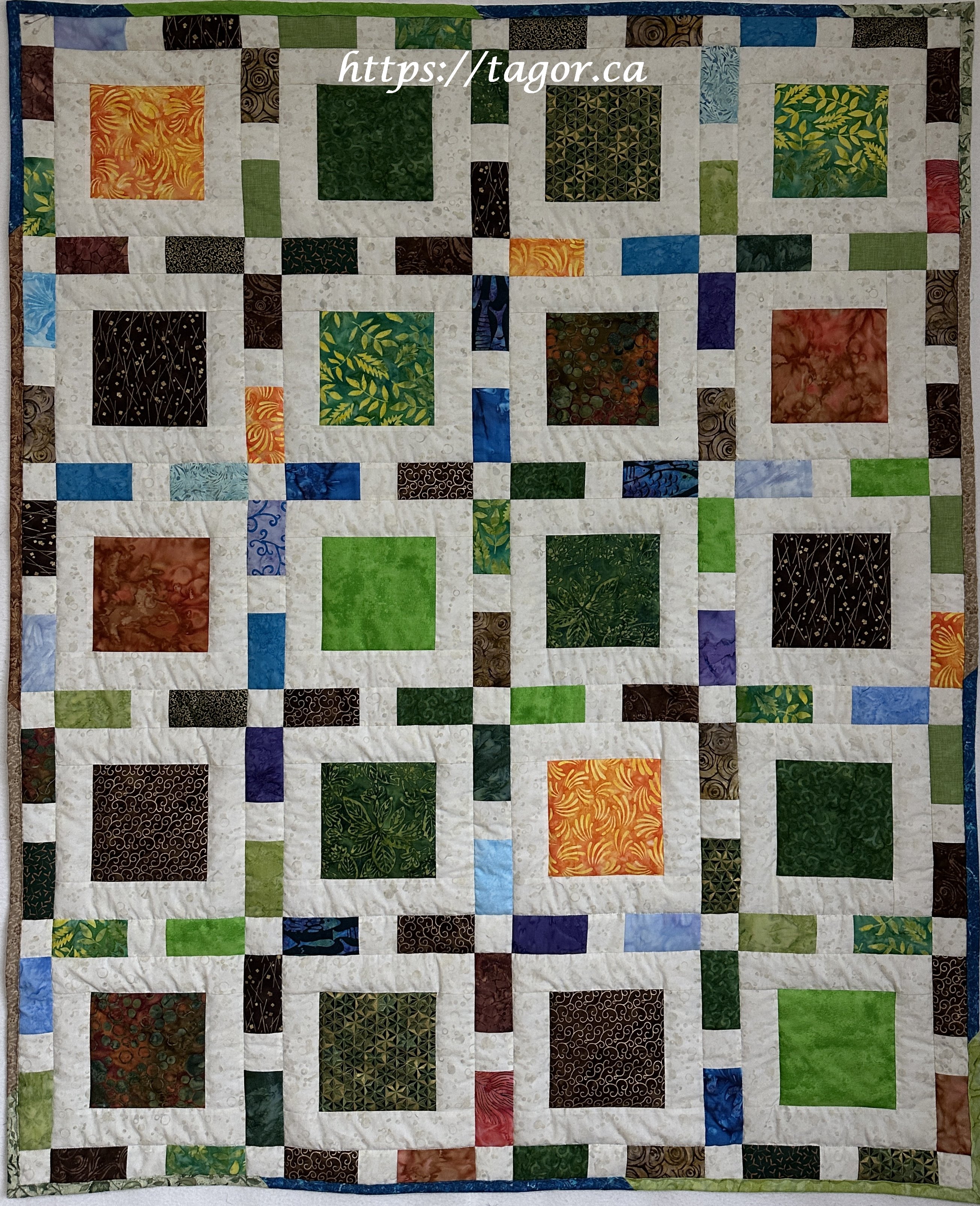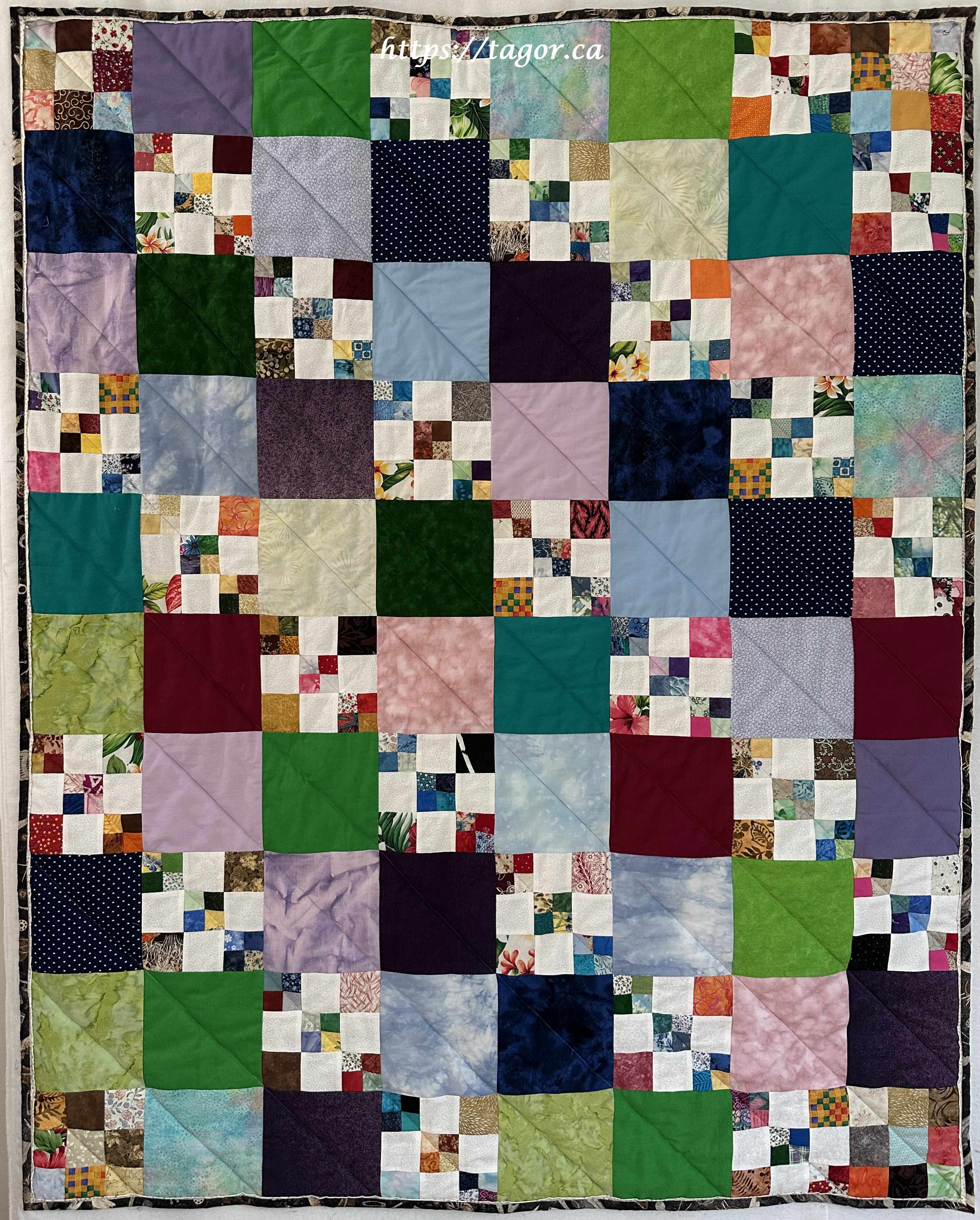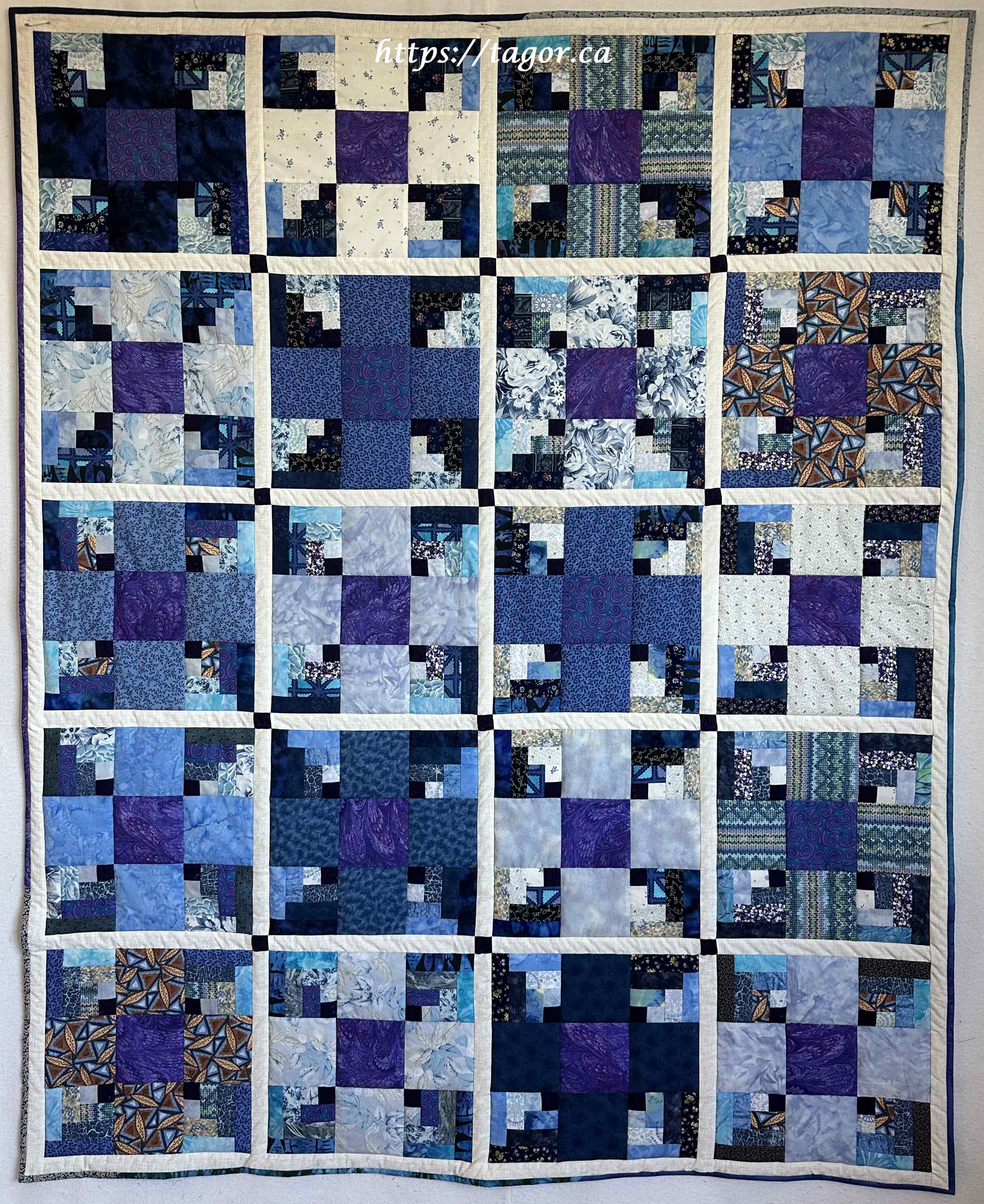 Donna went to town with hand appliquéd hexies! One block but the variations in fabric, sashing and quilting make each one unique.