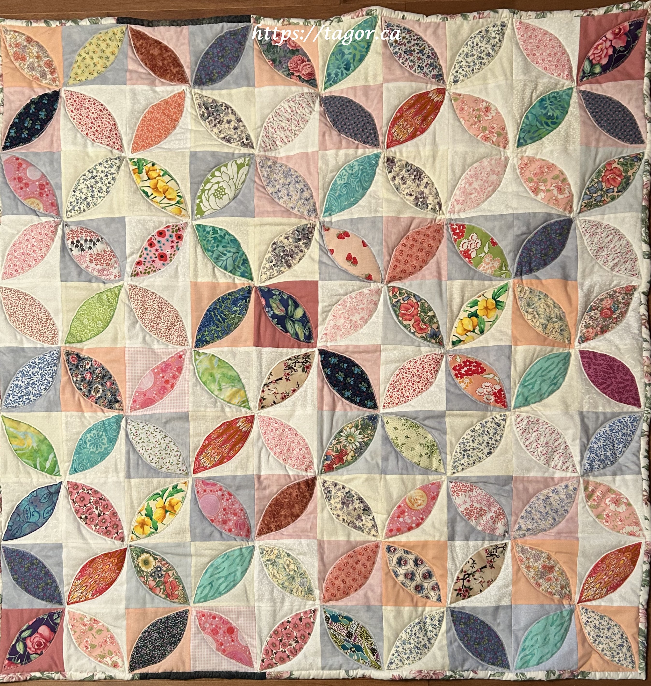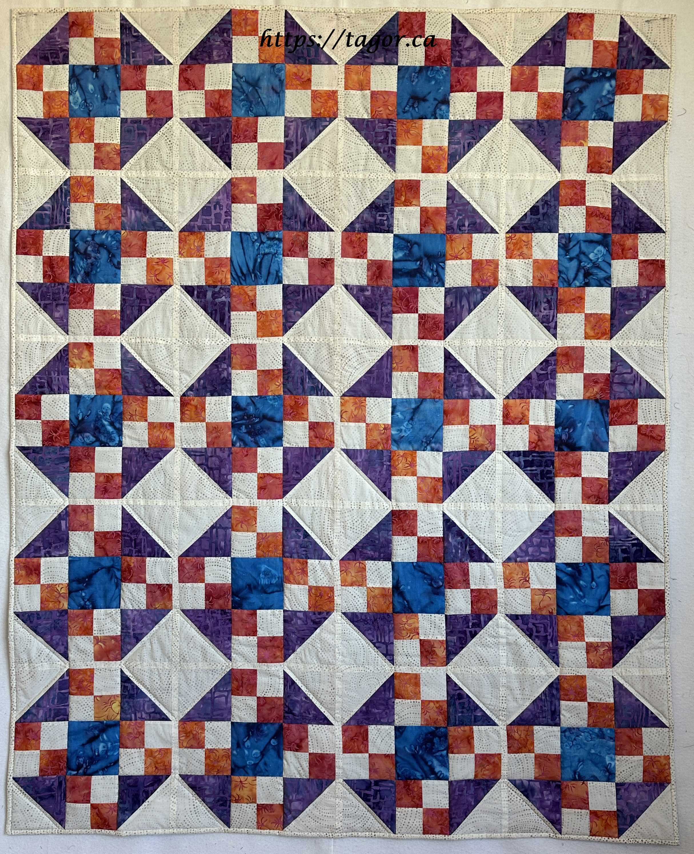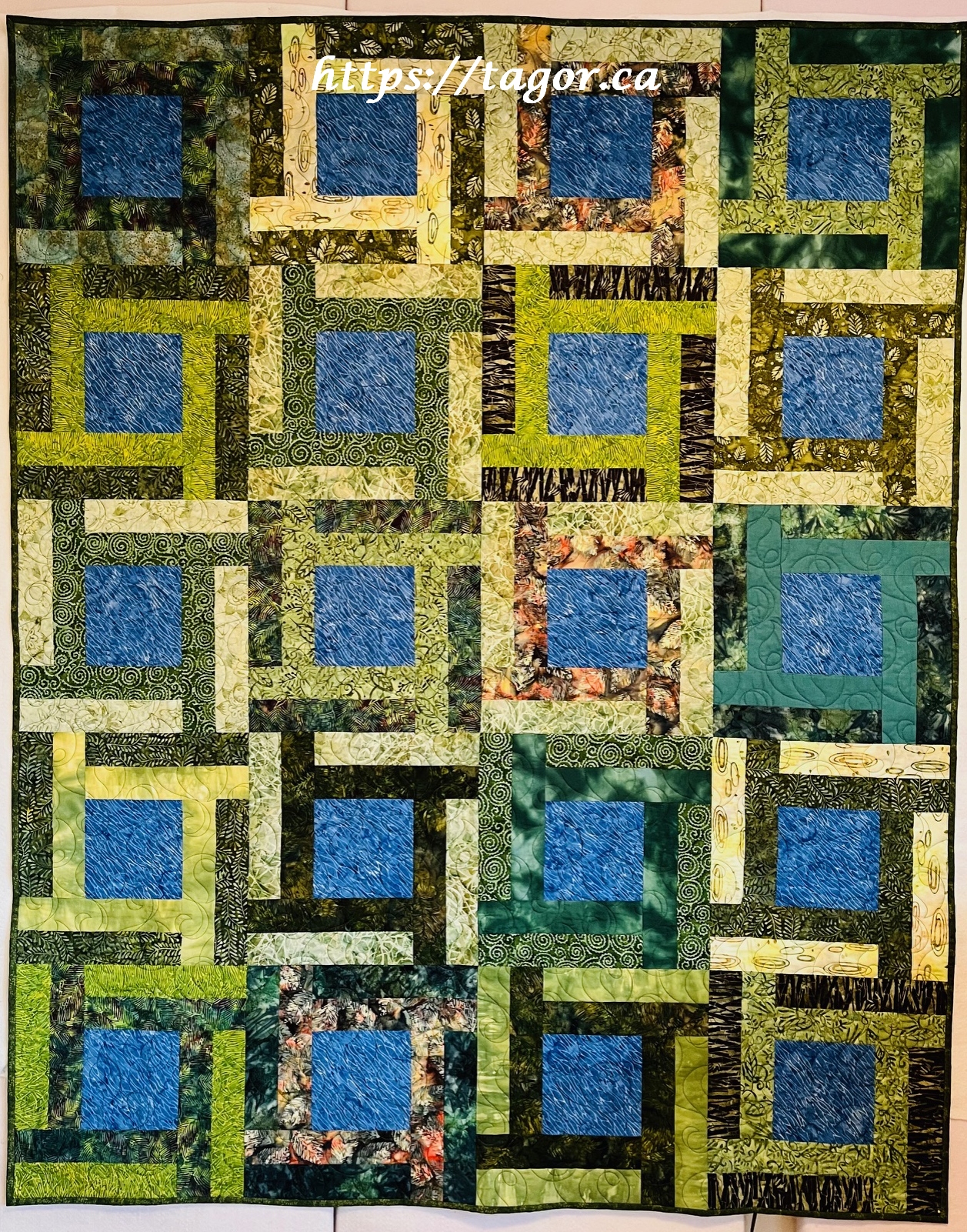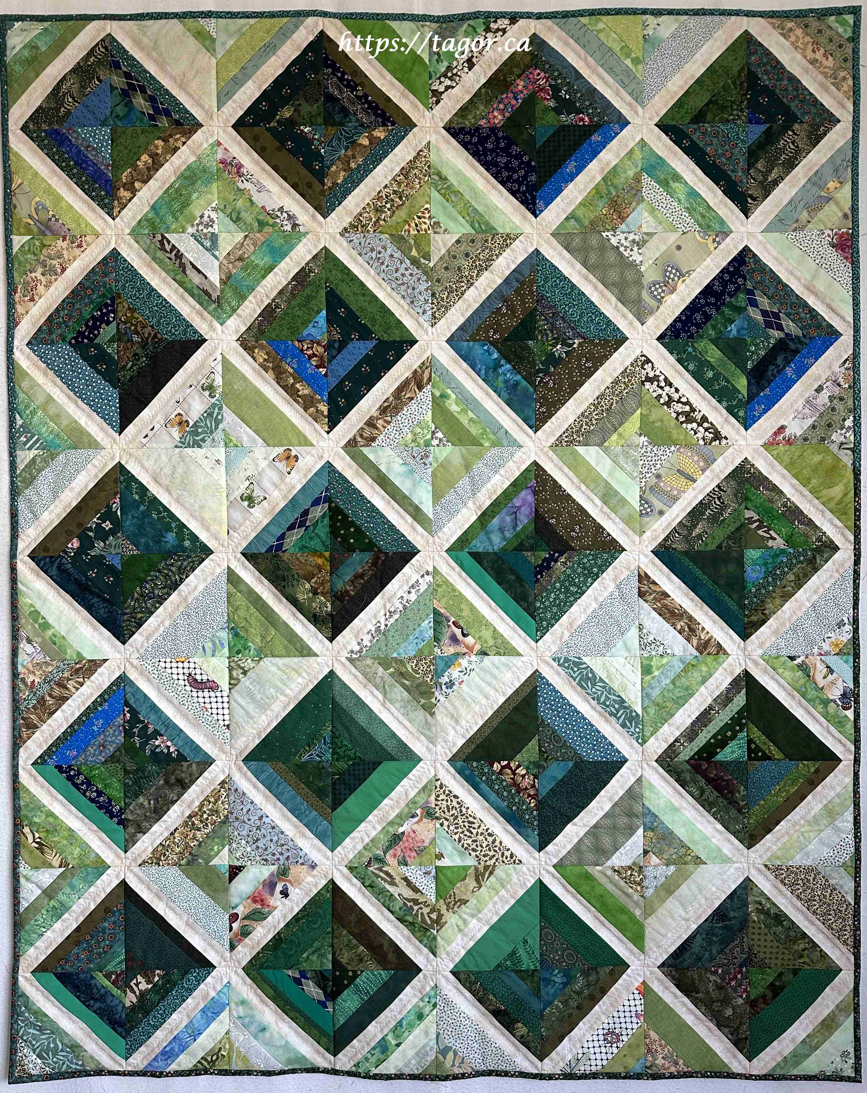 Donna went to town with hand appliquéd hexies! One block but the variations in fabric, sashing and quilting make each one unique.