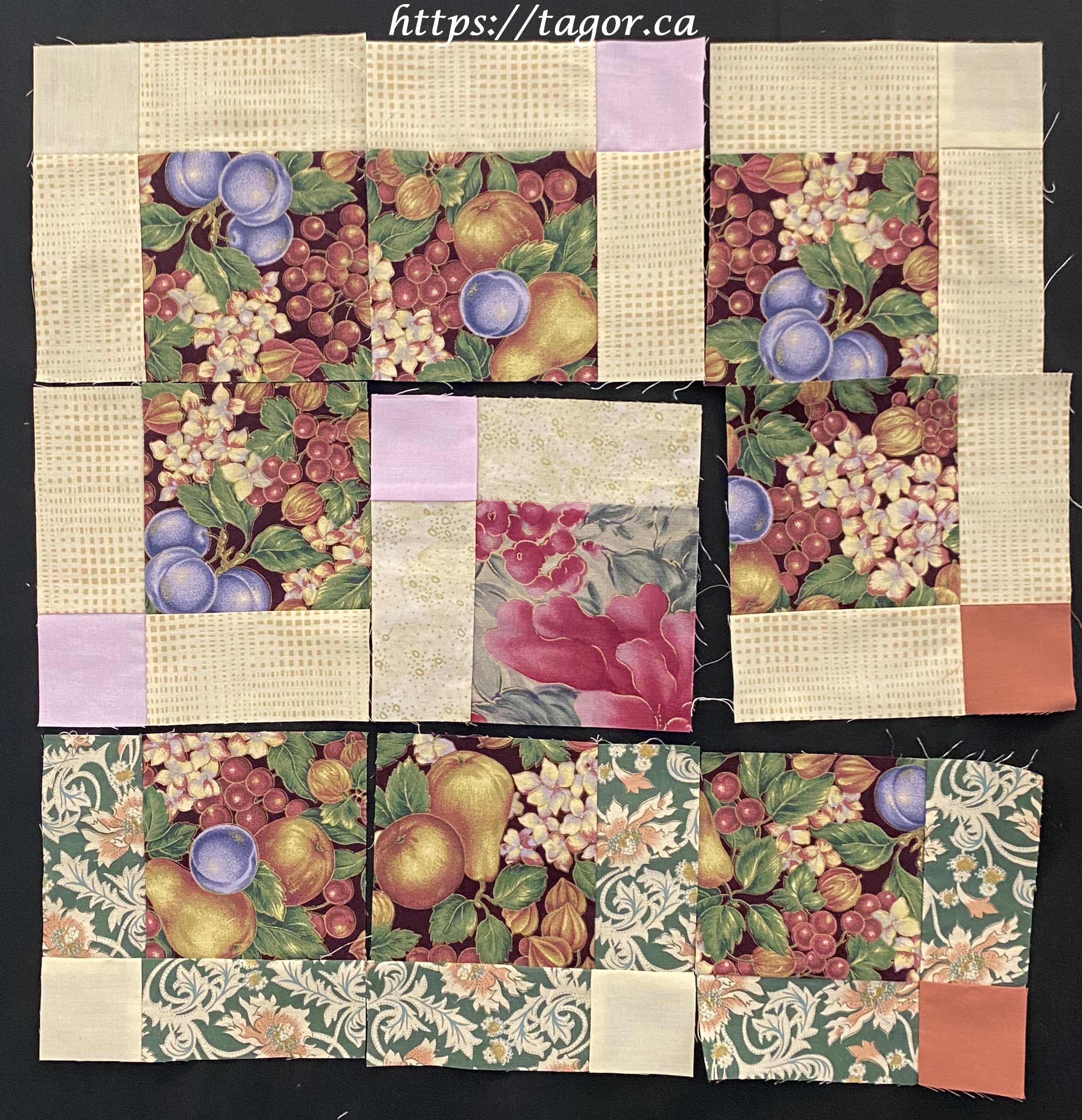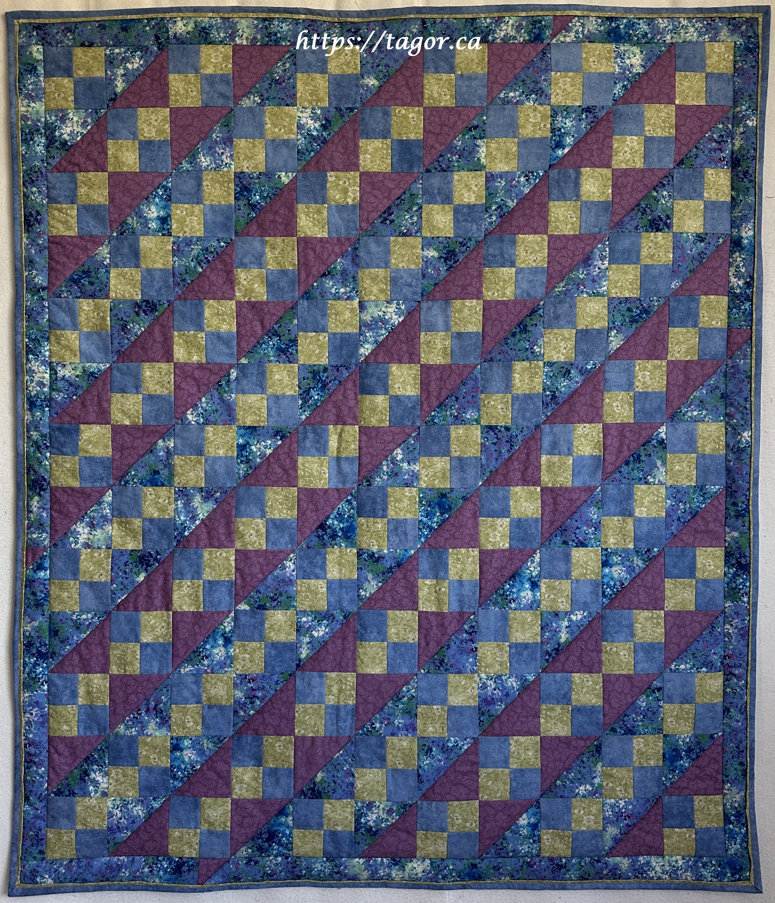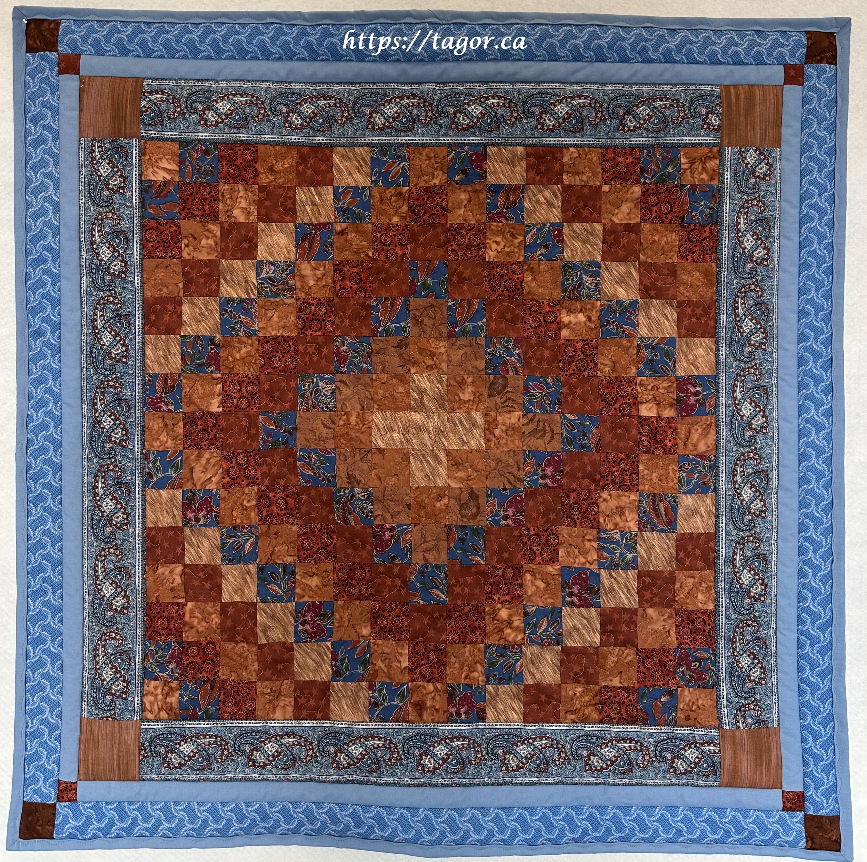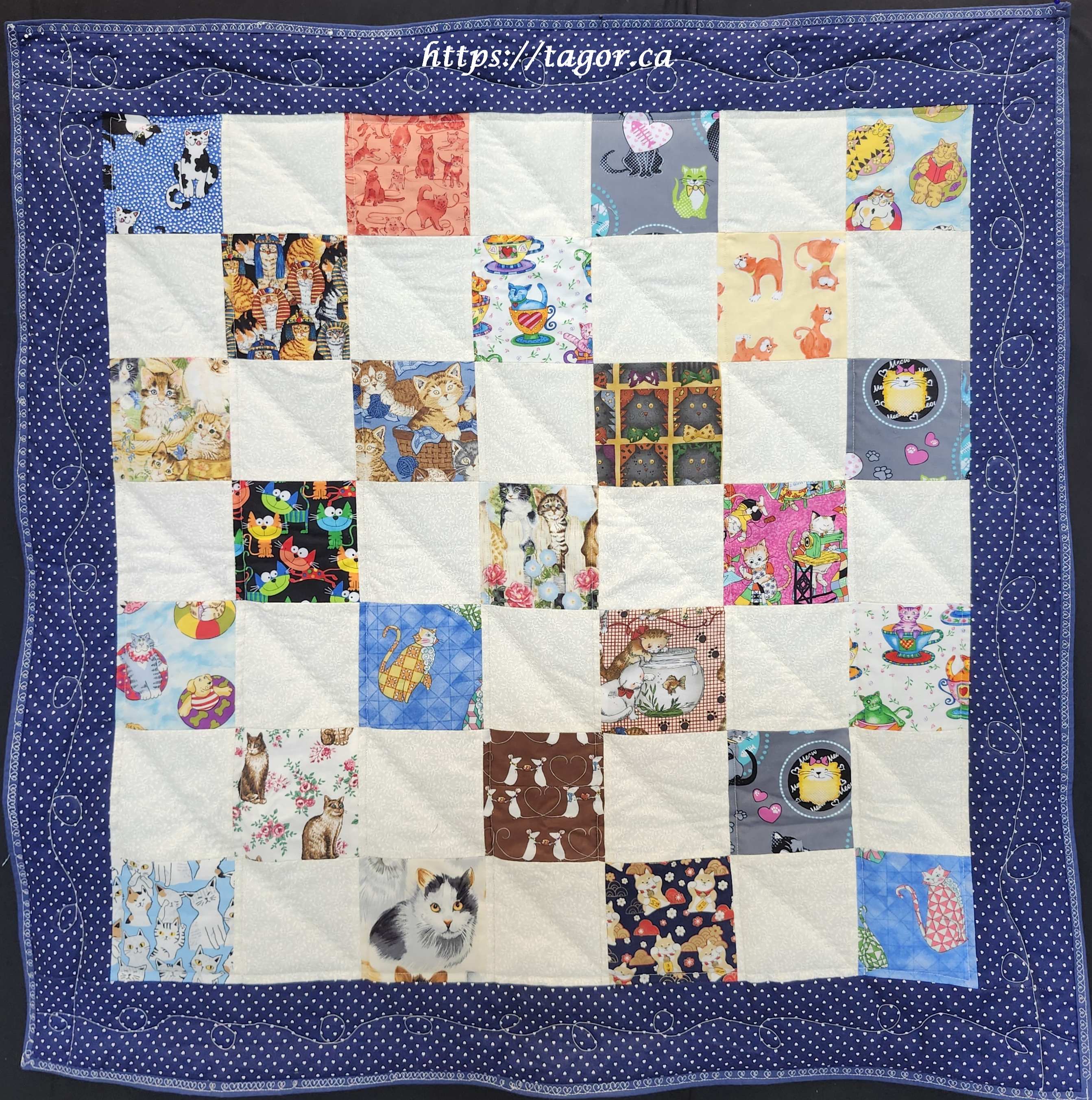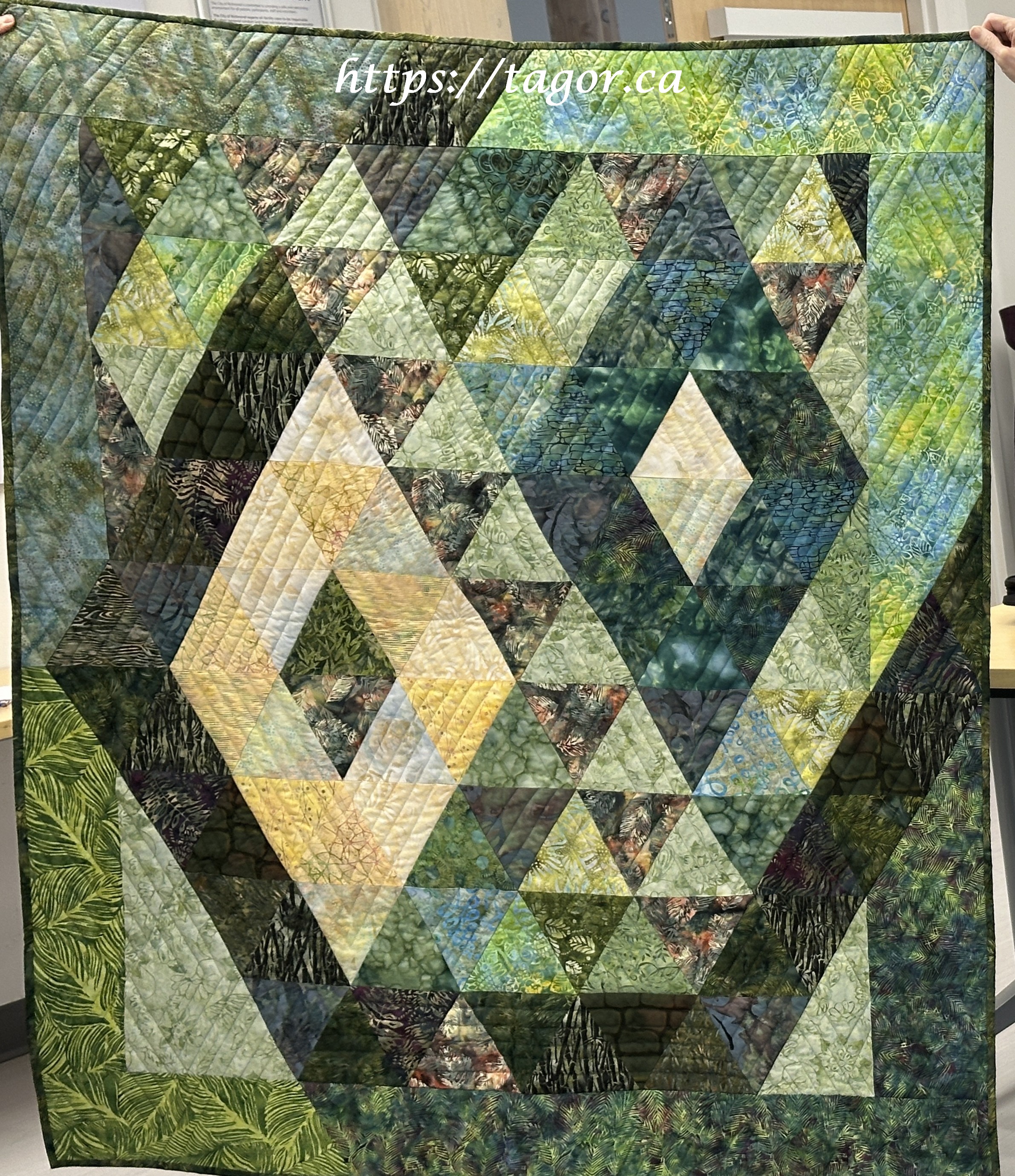 Donna went to town with hand appliquéd hexies! One block but the variations in fabric, sashing and quilting make each one unique.