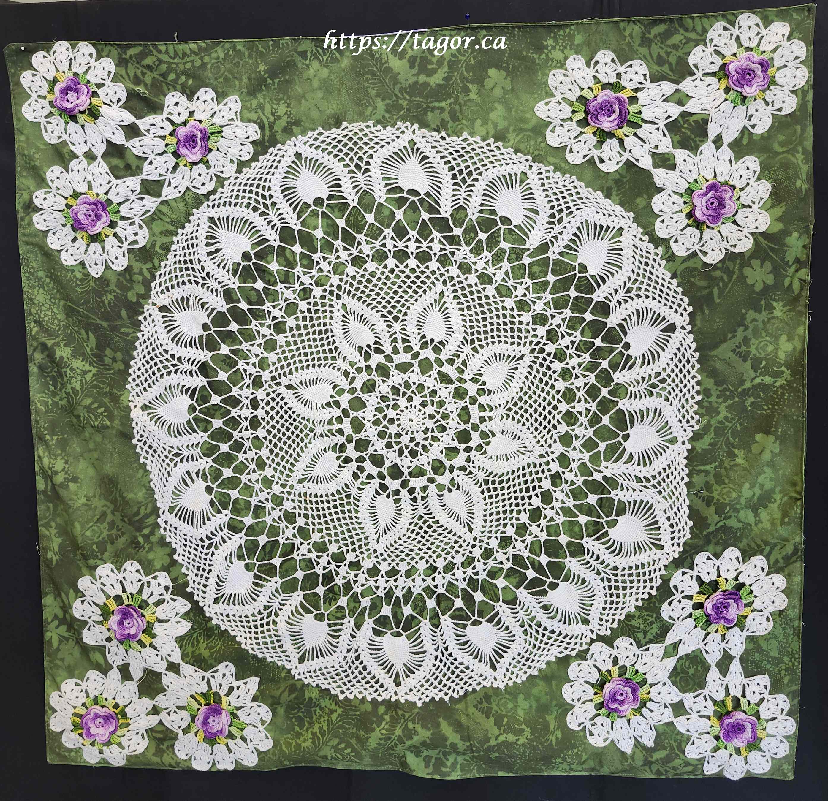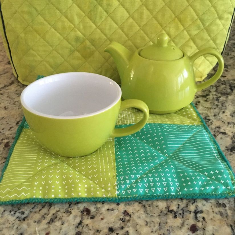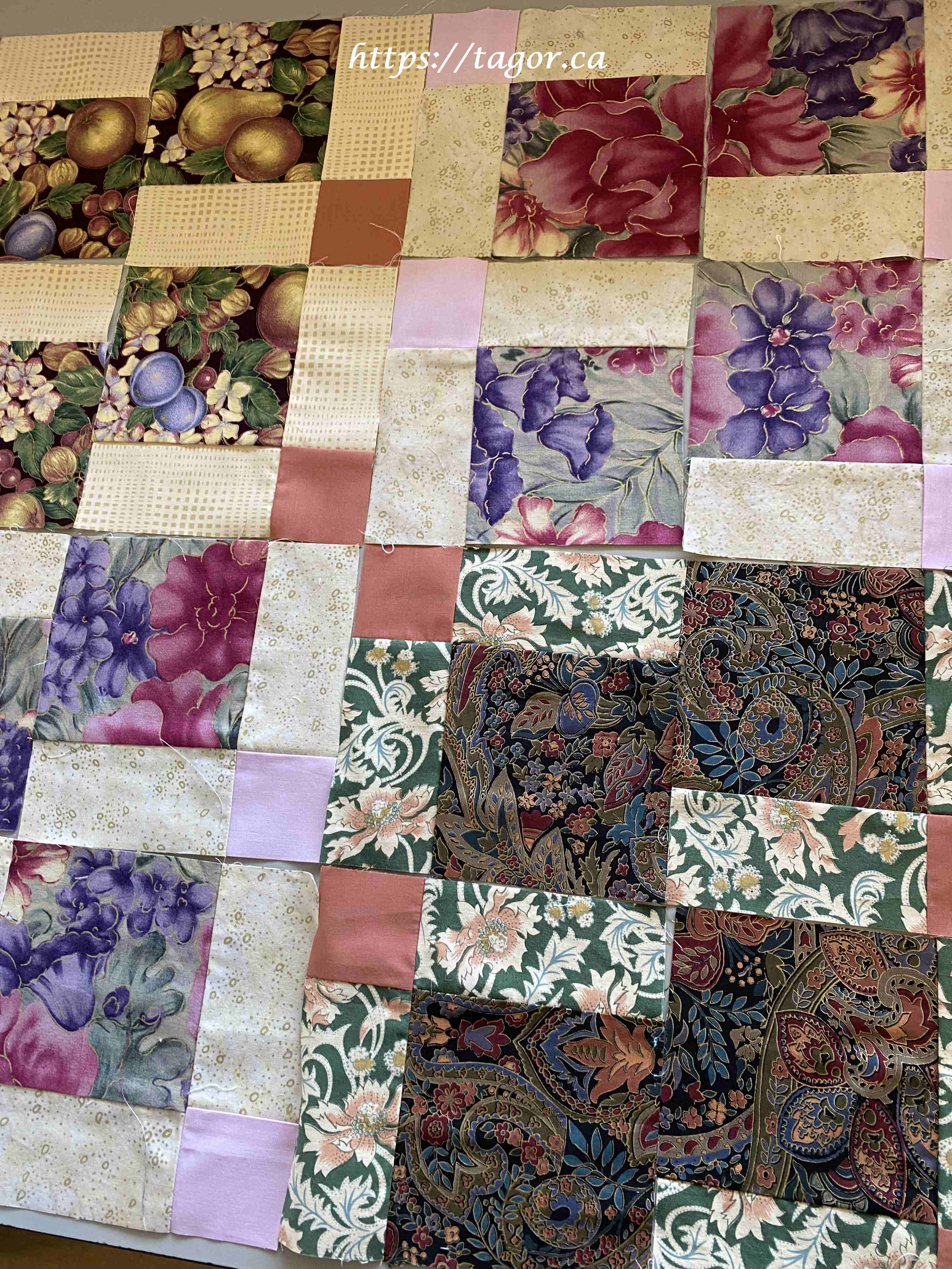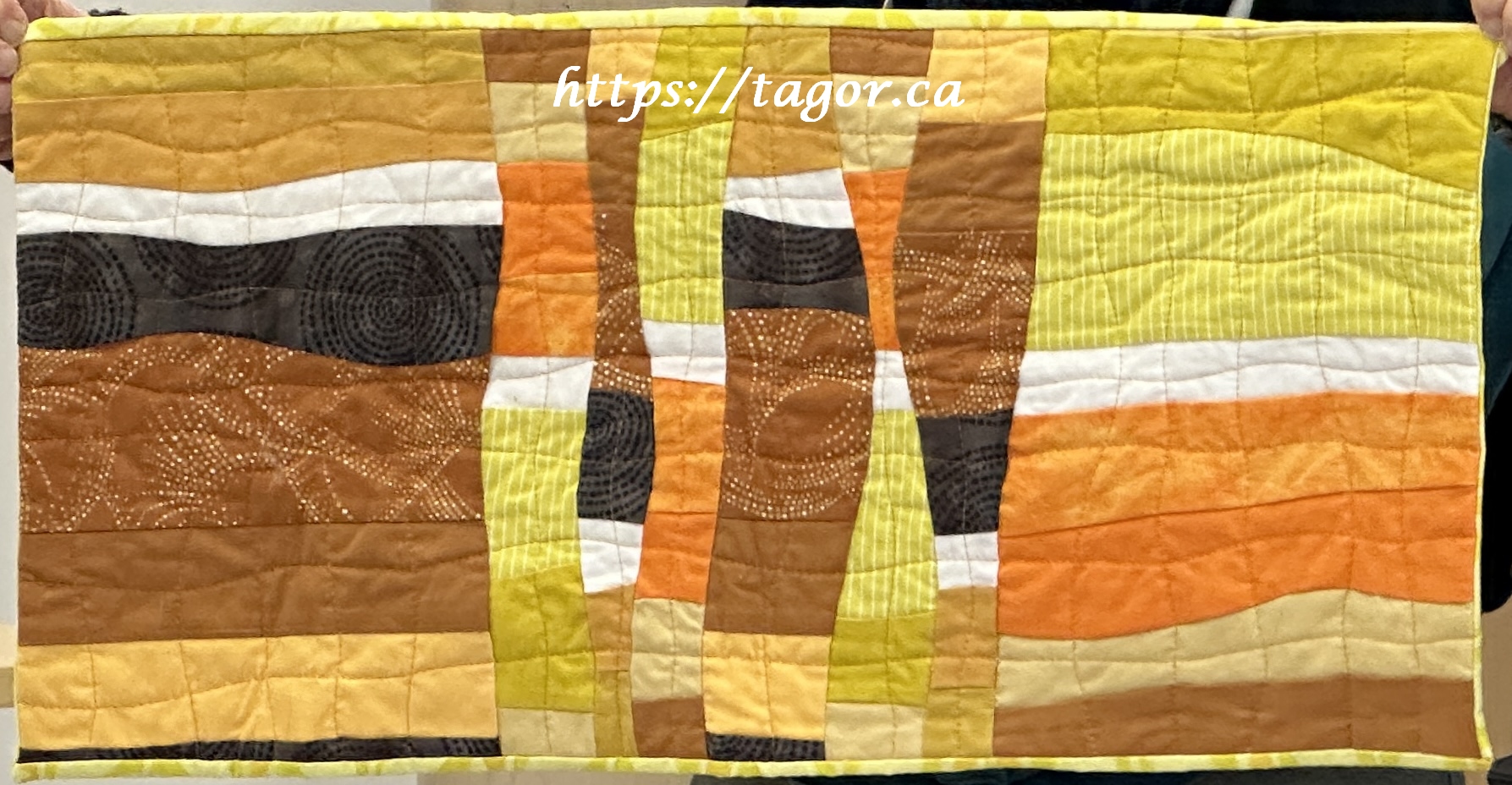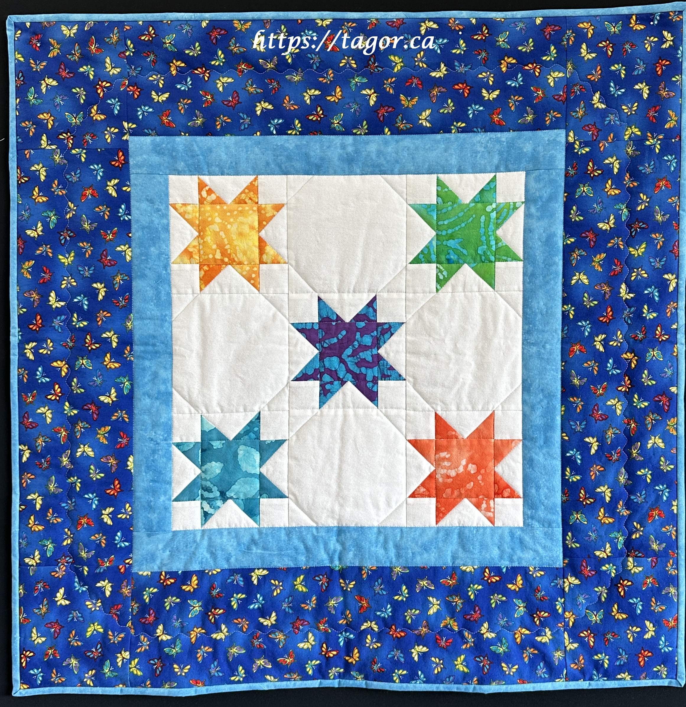 Donna went to town with hand appliquéd hexies! One block but the variations in fabric, sashing and quilting make each one unique.